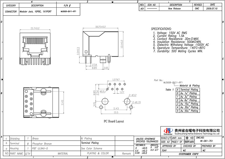 MJ5608-BX11-RF1 5621型1X1屏蔽 10P8C 脚前3.05